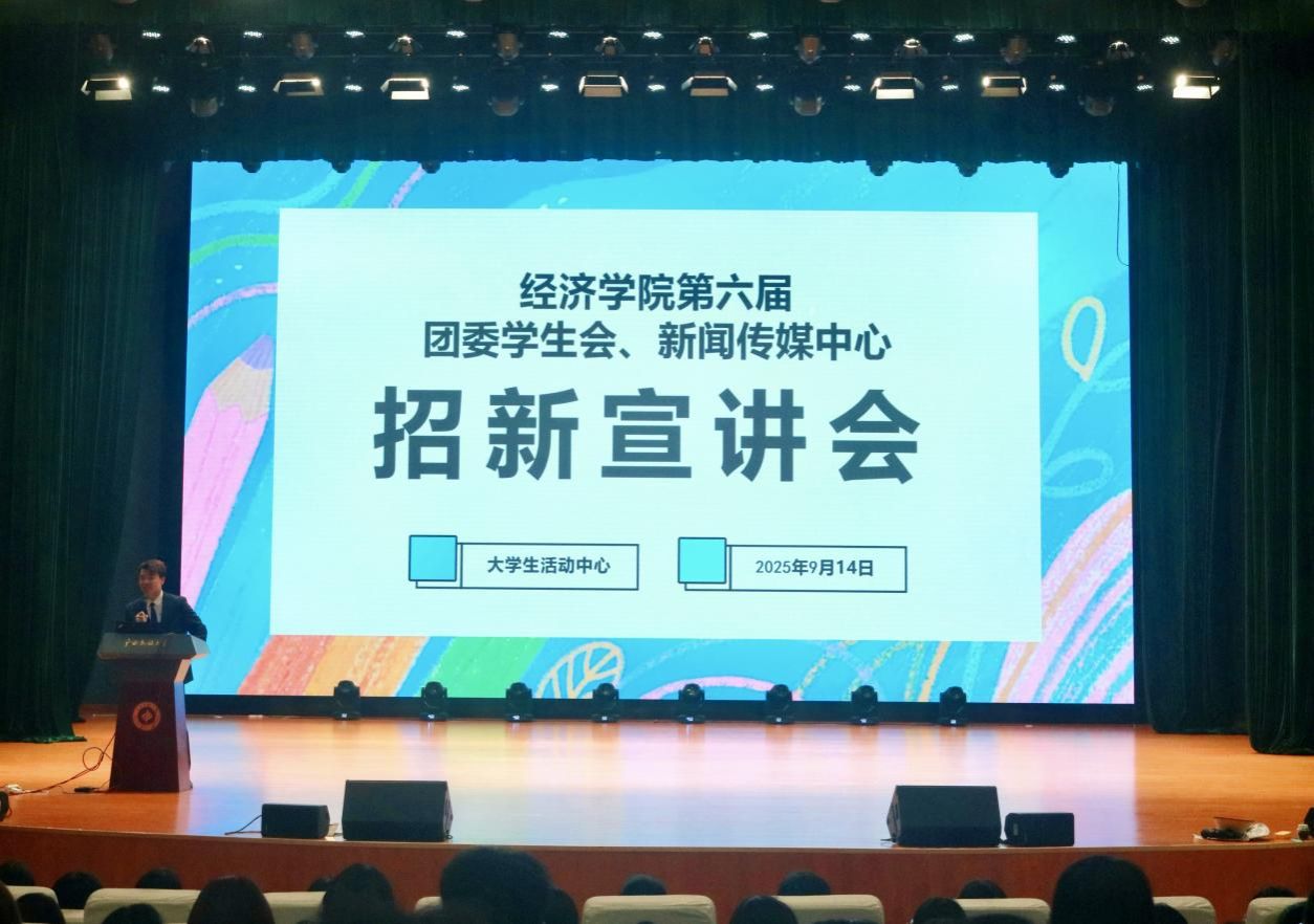 2025年9月14日下午,经济学院于思源湖校区大学生活动中心举办第六届团委学生会、新闻传媒中心招新宣讲会。本次会议由学生会执行主席李鸿瑞主持,2025级新生参会。