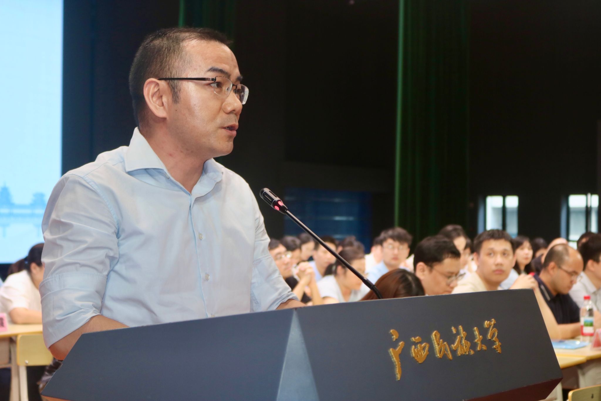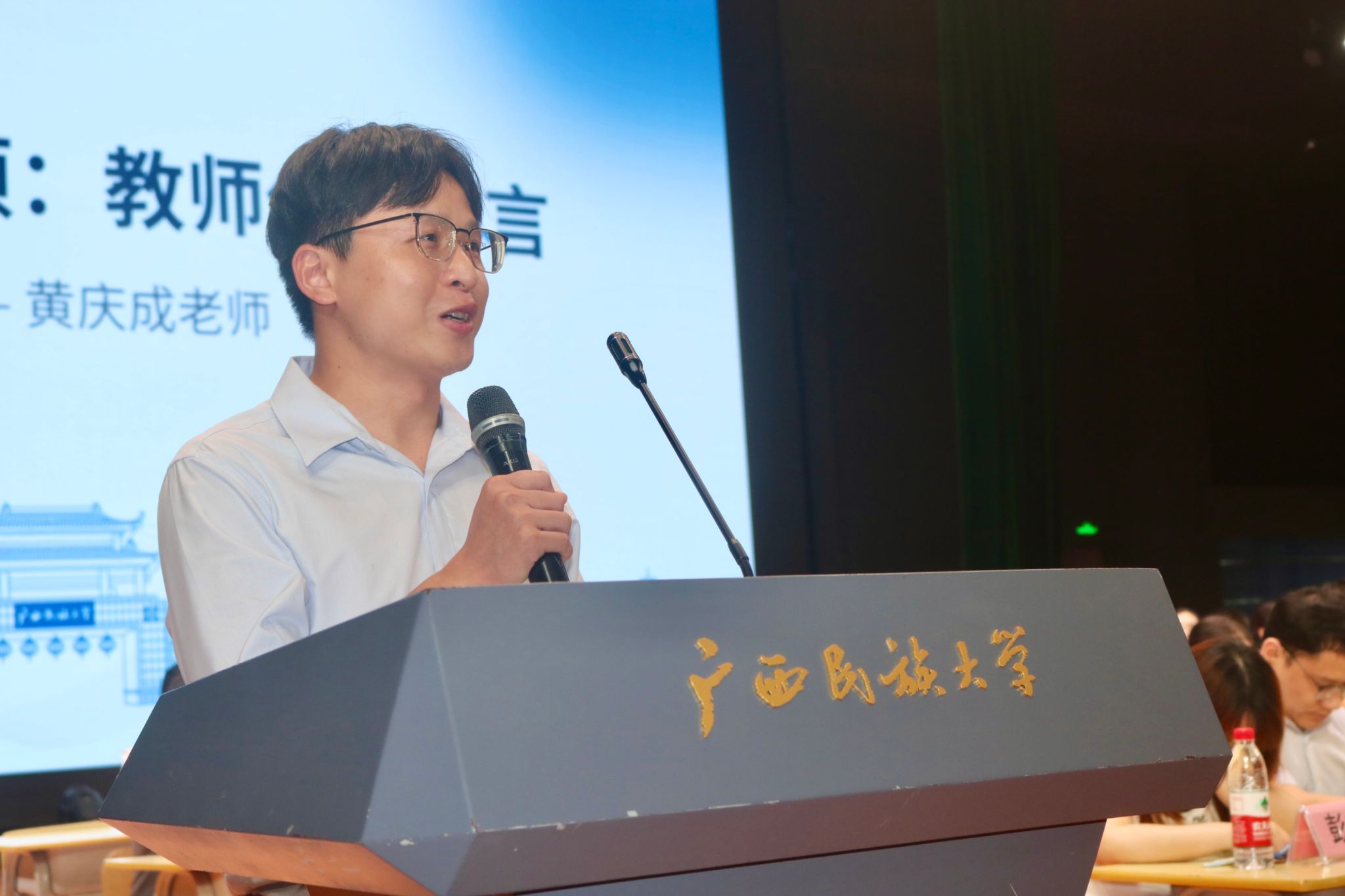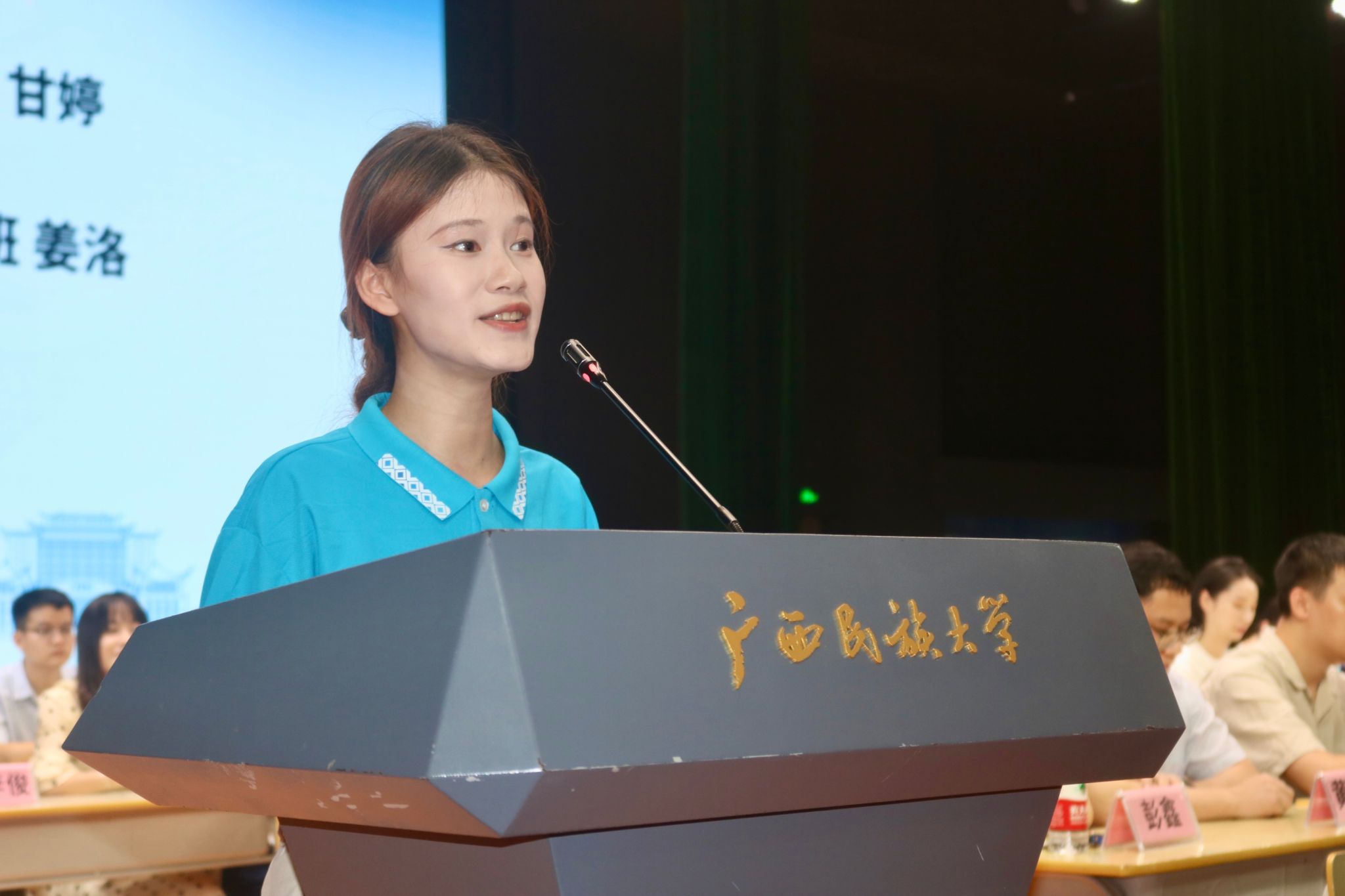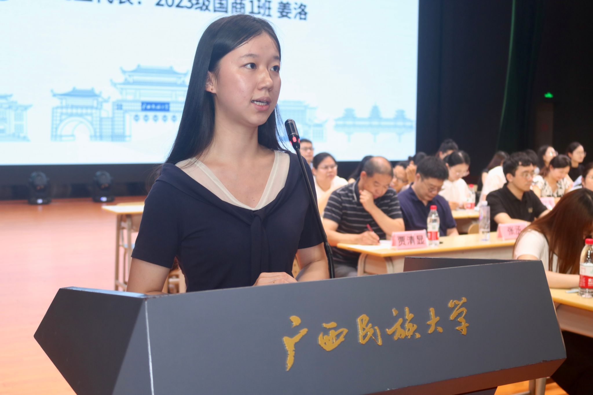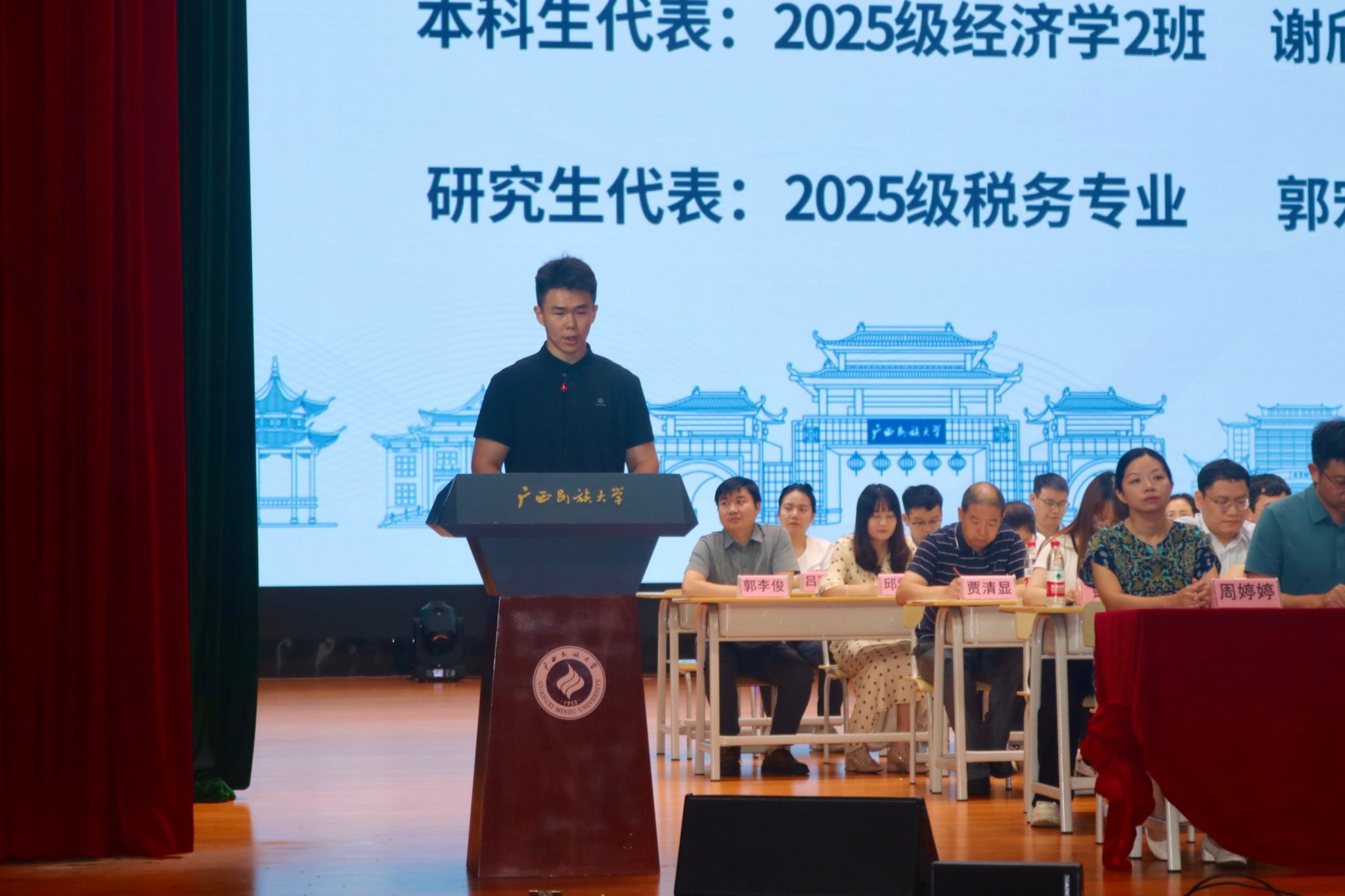 在发言环节中,本科新生代表2025级经济学2班谢欣瑜、研究生新生代表2025级税务专业郭宏宇、本科老生代表2022级卓越班甘婷、研究生老生代表2023级国际商务1班姜洛、教师代表黄庆成依次上台进行精彩发言。