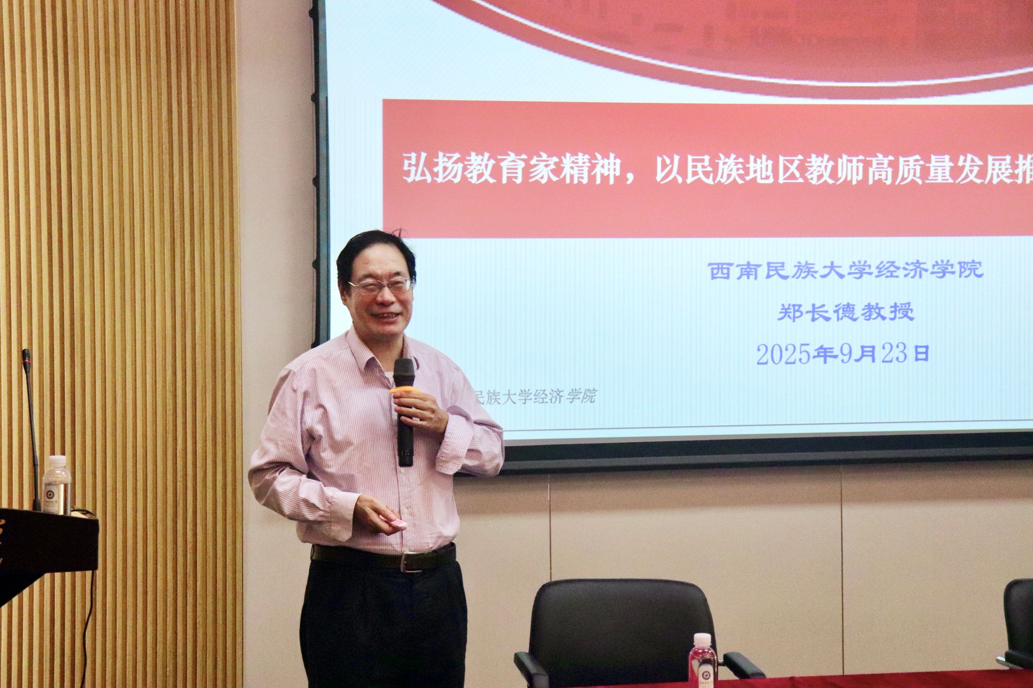 郑长德教授聚焦民族地区教师发展与队伍建设展开讲述。他指出,要提升教师培养培训质量,打造高素质专业化队伍,以更好应对民族地区教师队伍建设的挑战。同时要推动民族地区创新发展,保障教师政治、社会、资源地位,维护其职业尊严与权益,弘扬尊师重教风尚。他强调,强国必先强教、强教必先强师,要以教育家精神为引领,从思想建设、师风涵养等五方面发力,为教育现代化、教育强国建设和人民满意的教育提供支撑。
