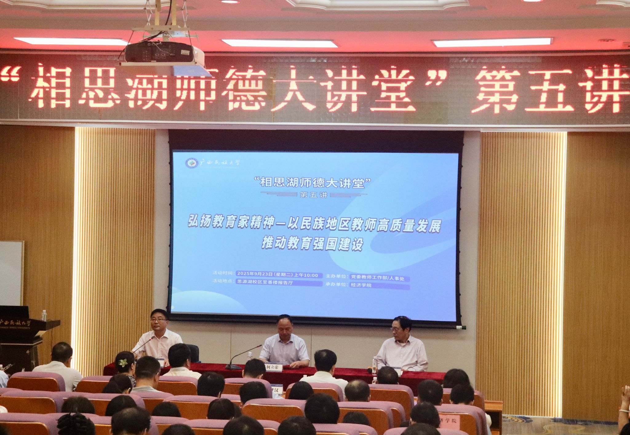 2025年9月23日上午,我院作为广西民族大学“相思湖师德大讲堂”第五讲的承办方,邀请到了西南民族大学郑长德教授在思源湖校区至善楼报告厅作主题为“弘扬教育家精神——以民族地区教师高质量发展推动教育强国建设”的讲座。本次讲座邀请到了学校党委常委、副校长何立荣出席讲座并致词,思源湖校区部分学院教职工和学生代表参加讲座。