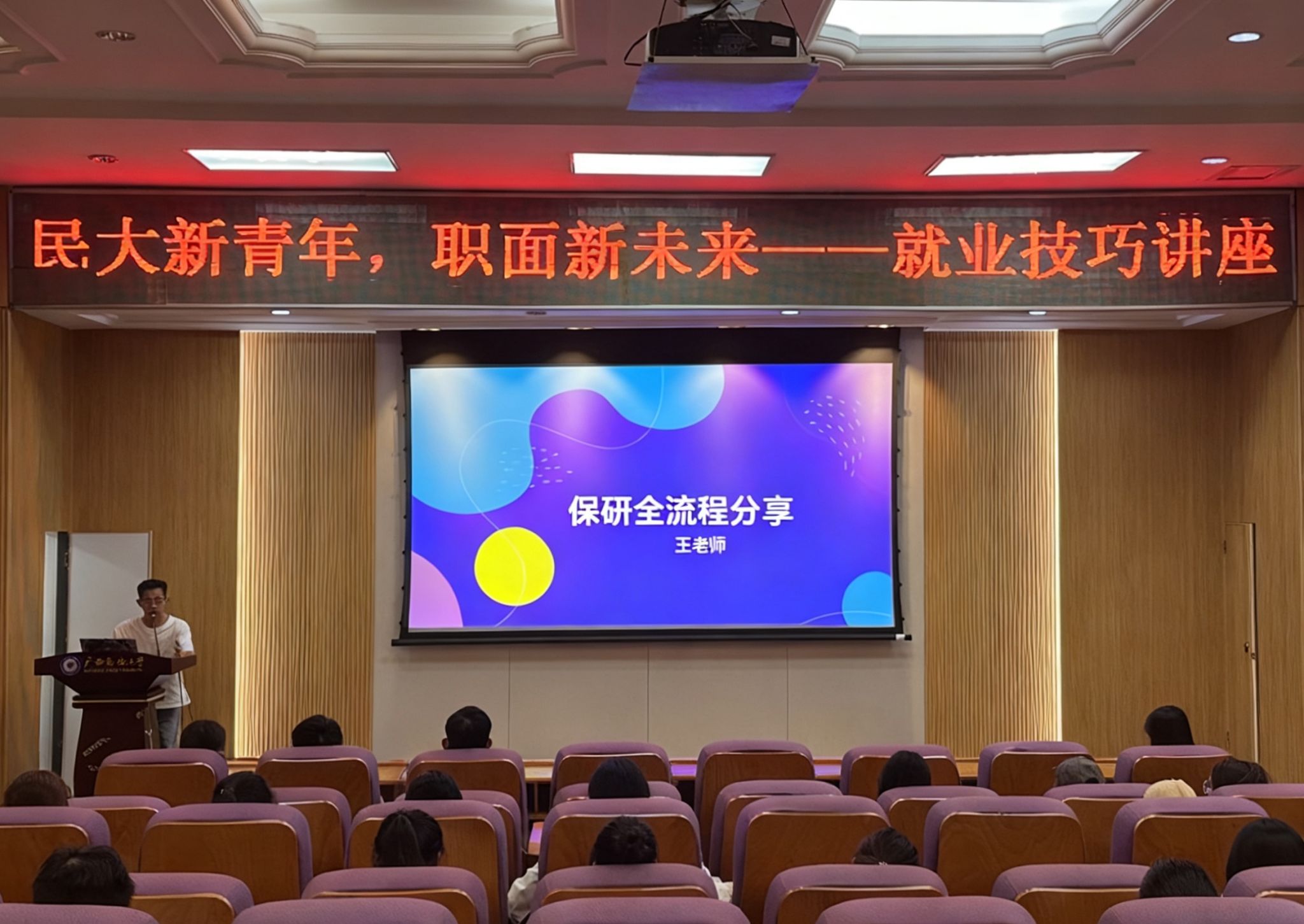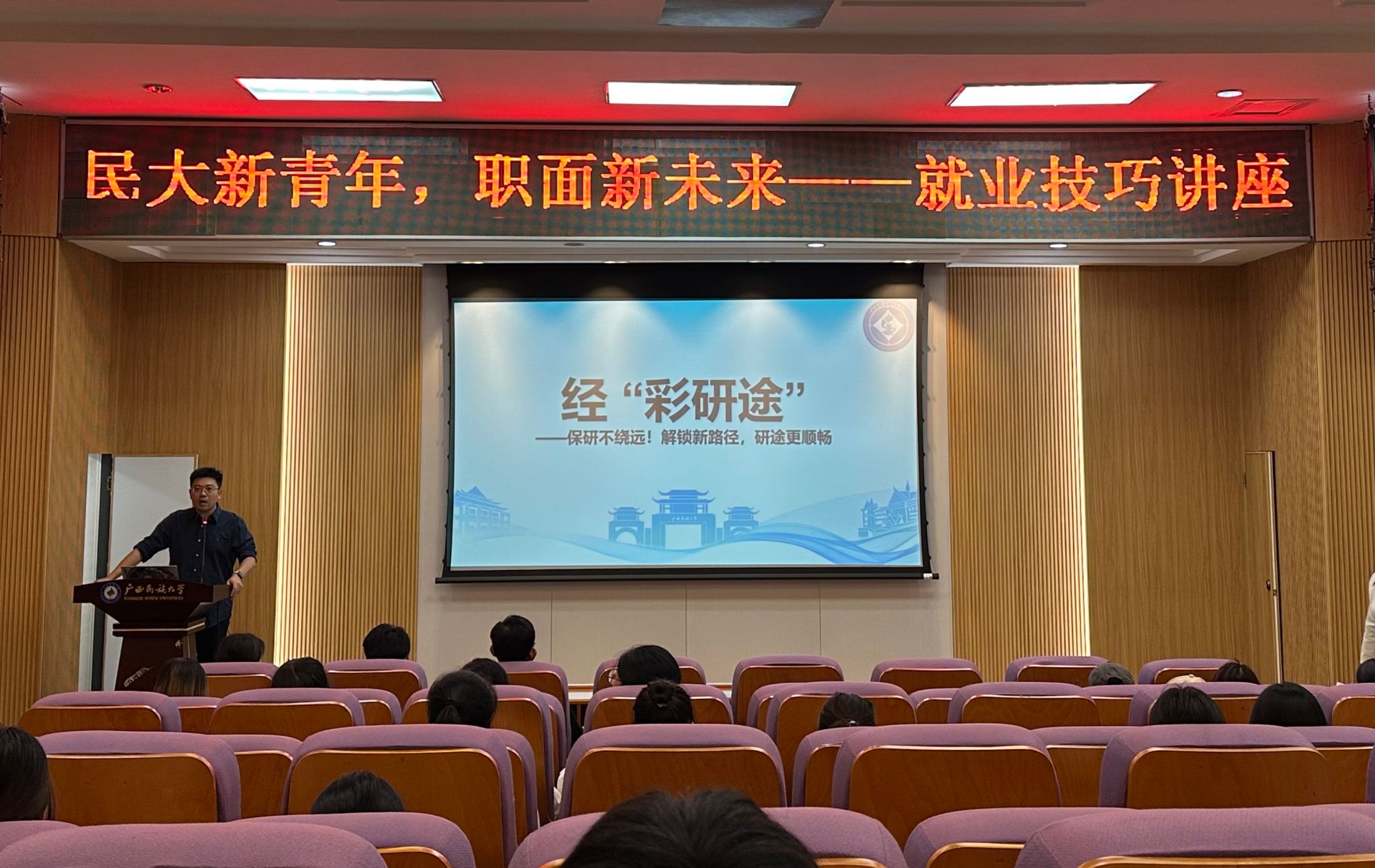 2025年10月21日,为拓宽就业渠道、促进学生就业,充分发挥党团共建的引领作用,我院于至善楼报告厅举办推免经验分享会。本次会议由我院孟庆蛟老师主持,资深推免规划师王力学主讲,2026届推免成功的学生代表2022级国际经济与贸易4班袁婷、2022级税收学1班杨佳佳分享经验,有考研意向的本科生参会。
