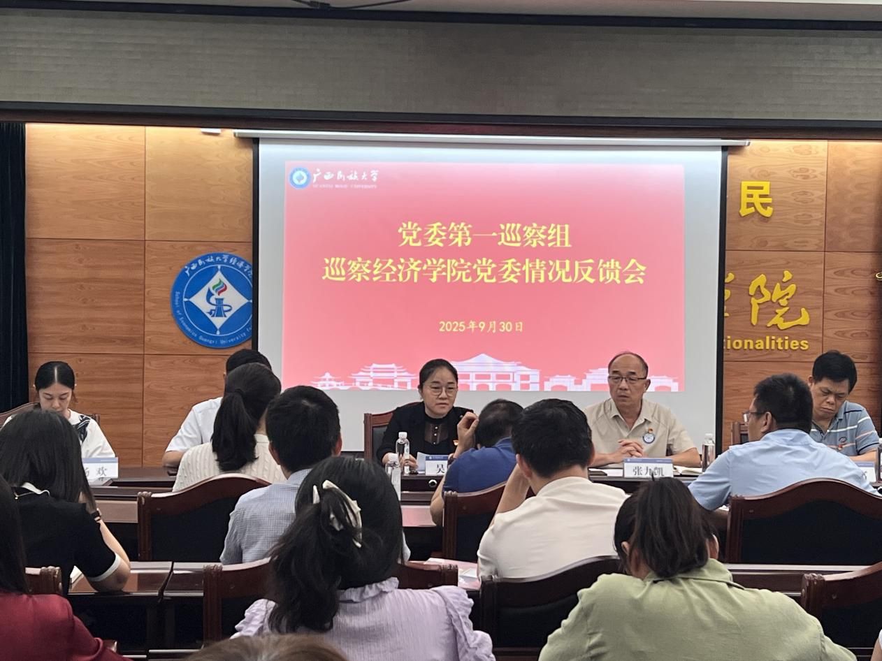 2025年9月30日,学校党委第一巡察组巡察经济学院党委情况反馈会在格物楼206召开。学校党委巡察工作领导小组成员、学校党委巡察办主任兼党风廉政办公室主任吴旭桦、学校党委第一巡察组组长张九凯等相关同志出席会议,经济学院党委书记韦志江主持会议,学院全体教职工列席。