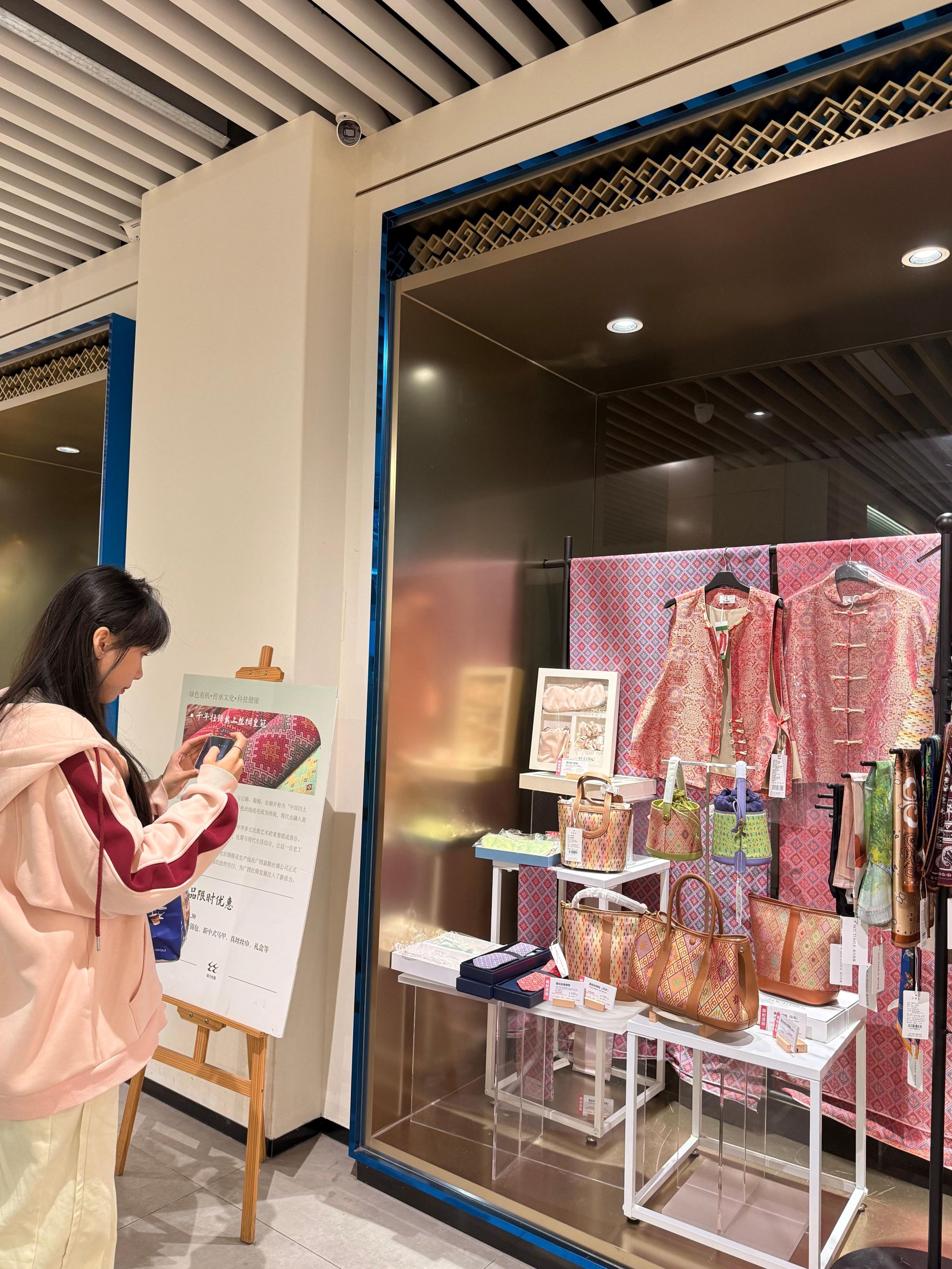 2025年11月2日,我院自治区级大学生创新创业计划立项项目“桂锦绣缘文创基地”小组负责人唐蕾、韦翊凌前往广西壮族自治区博物馆,参观主题特展《壮锦纹样的美学密码》。该小组计划以此次参观为基础,从美学价值维度深入探索,推动壮锦与文创产品的深度融合,助力壮锦文化创新发展。