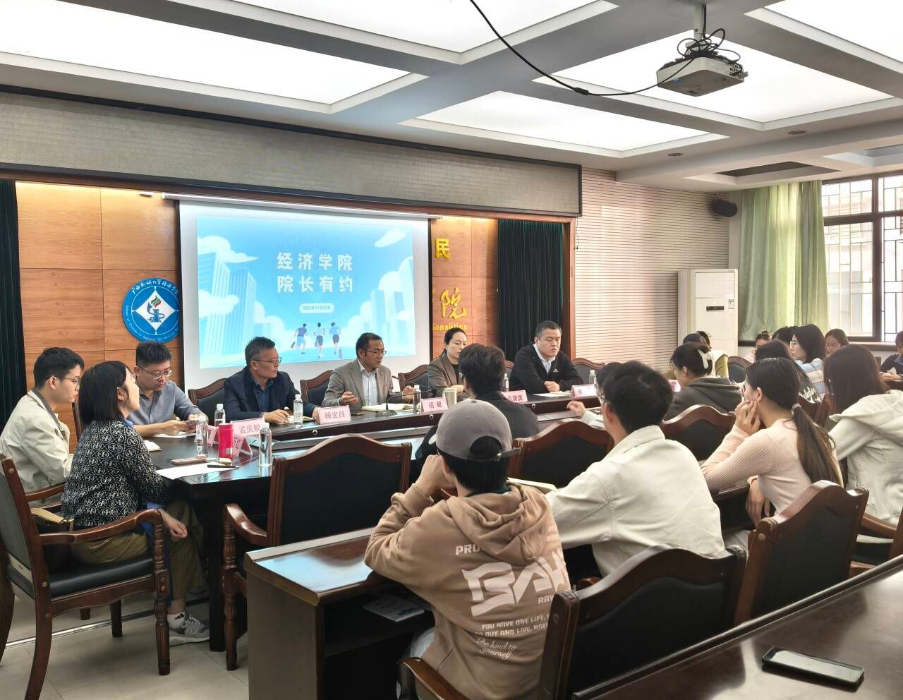 2025年11月25日下午,我院于格物楼206室举办“院长有约”本科生座谈会。我院院长胡超、党委副书记范潇潇、院长助理、经济系系主任杨宏昌、国际经济与贸易系系主任廖万红、税收系系主任孟庆蛟、数字经济系系主任张文杰、团委书记段莹、辅导员黎靖、吕亮宇出席会议,与各本科班级学生代表面对面交流。