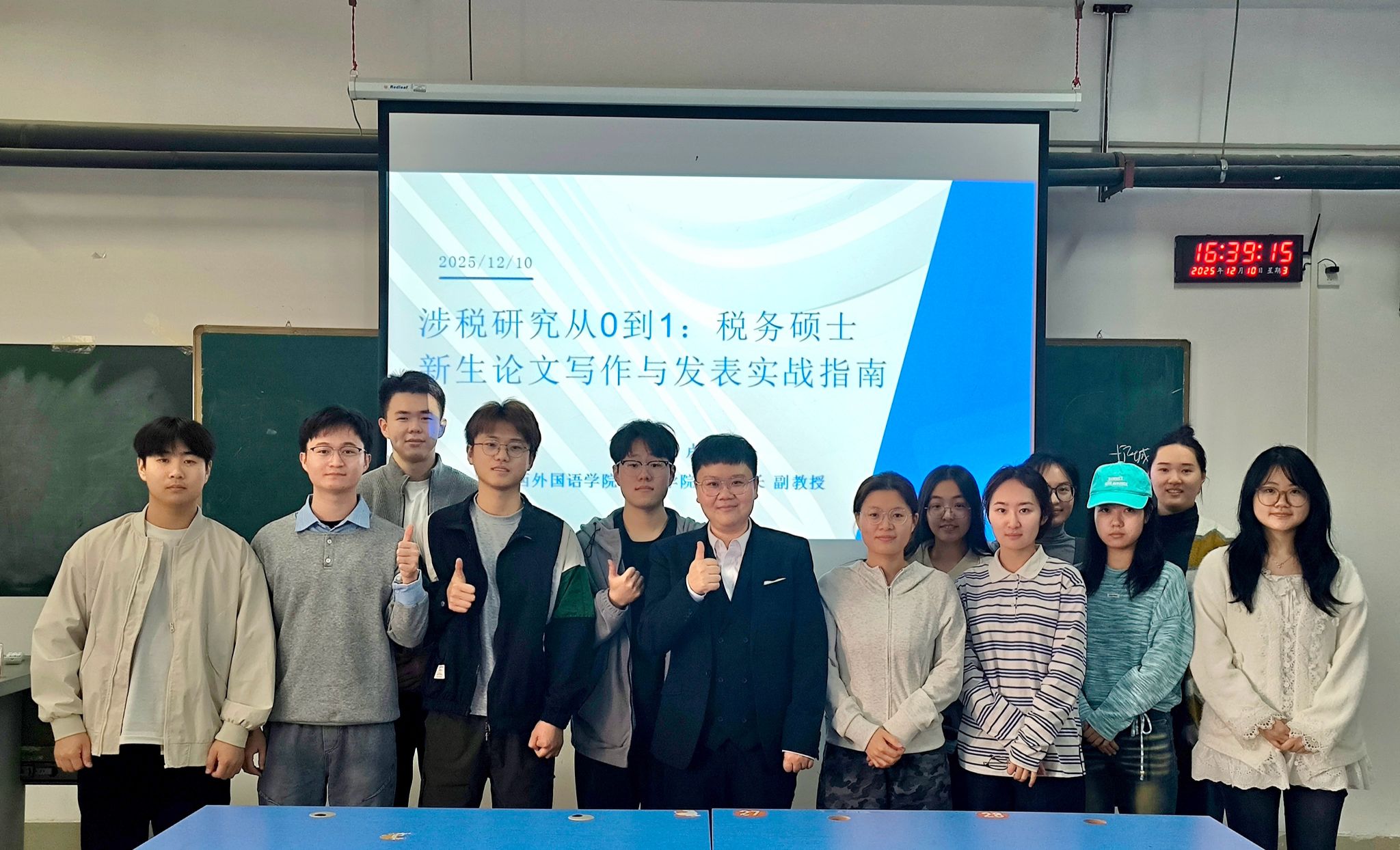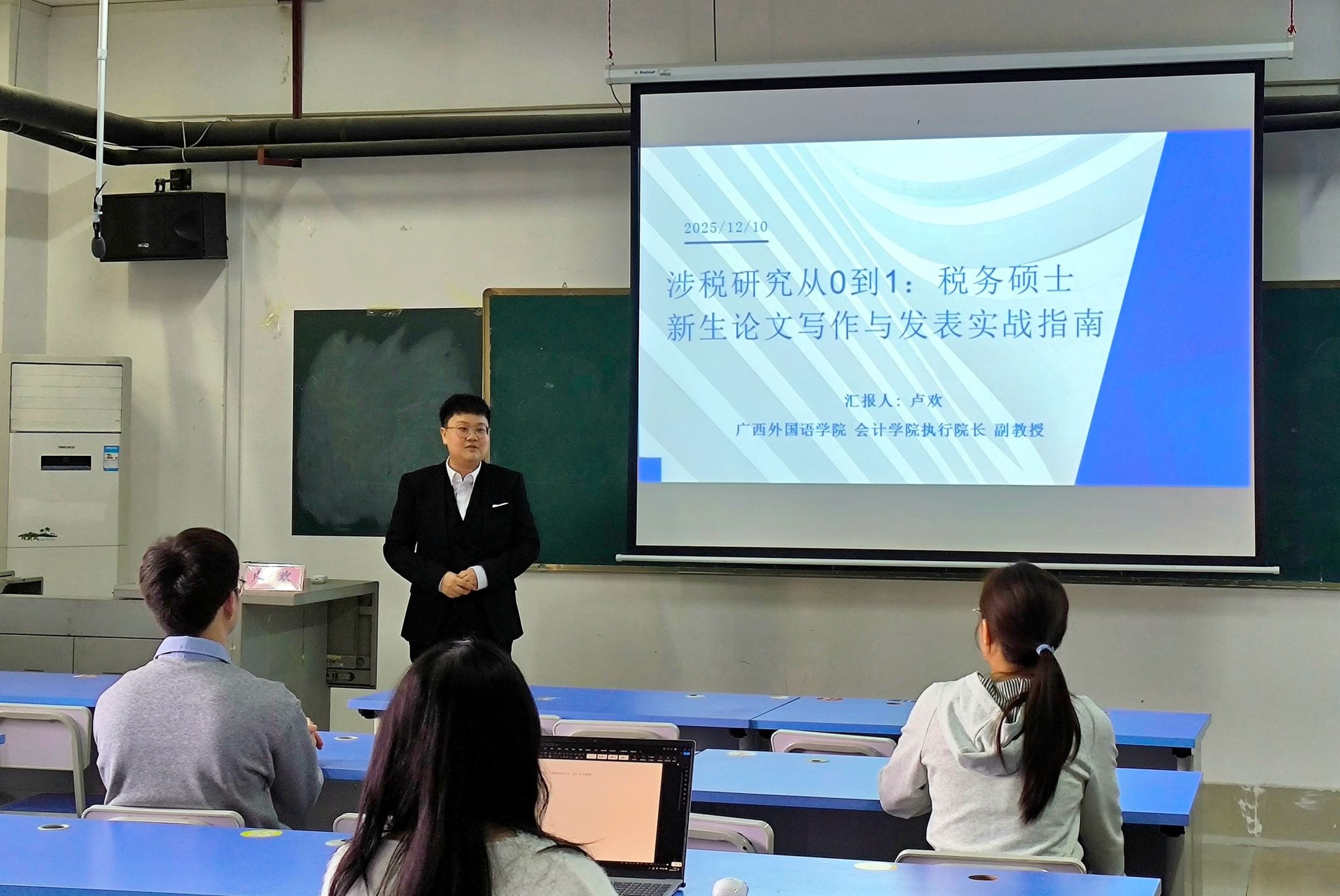 2025年12月10日,我院开展了主题为“涉税研究从0到1:给税务专业新生的论文写作与发表实战指南”的专题讲座。本次讲座邀请了税务硕士校外导师、广西外国语学院会计学院执行院长、广西财税科学应用研究会专家卢欢副教授主讲,2025级税务专业学生代表参加。
