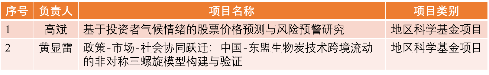 根据8月27日国家自然科学基金委员会发布的《关于2025年国家自然科学基金集中接收申请项目评审结果的通告》,广西民族大学经济学院高斌老师、黄显雷老师分别获得地区科学基金项目资助。具体项目信息如下: